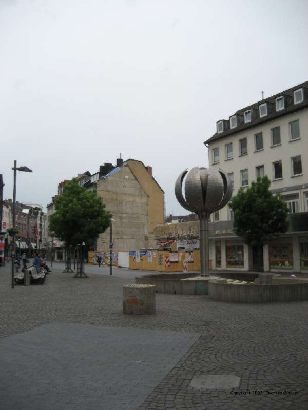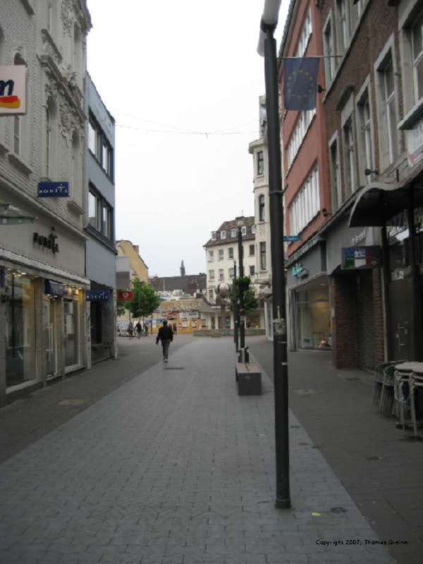 Unten, das ganze noch einmal, mit mehr Perspektive. Für Ortsunkundige, wenn man der Fußgängerzone, links im Bild, weiter folgt, kommt man zum Elisenbrunnen in Aachen. Dort kann man das heiße Quellwasser, welches aus den Thermalquellen unterhalb Aachens strömt, probieren. Diesen Quellen ist unter anderem der Aufenthalt Karl des Großen in Aachen zuzuschreiben. Aber Vorsicht, es wirkt stark abführend!
