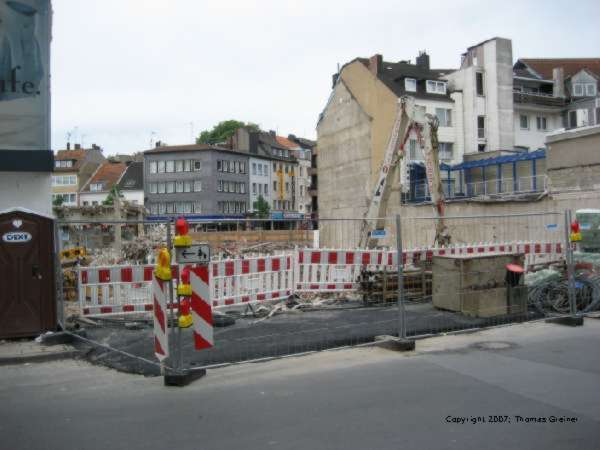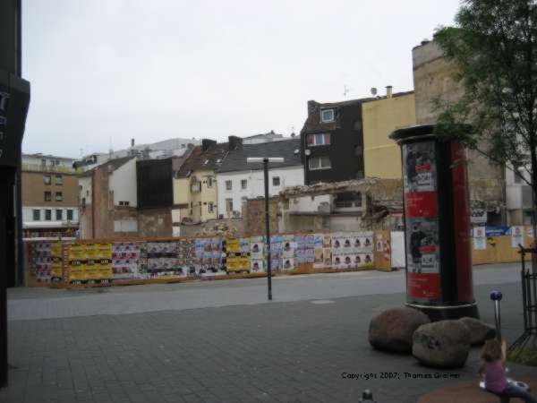 Die Reste des Handy Ladens von hinten gesehen. Im Hintergrund in der Mitte zwischen den Häusern, ist der Bereich zu sehen, der voraussichtlich auch vom Umbau der Kaiserplatzgalerie betroffen sein wird.