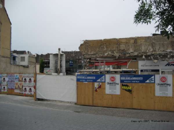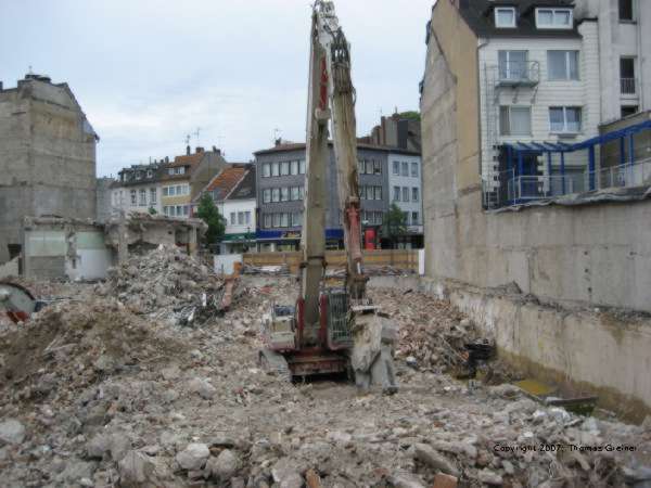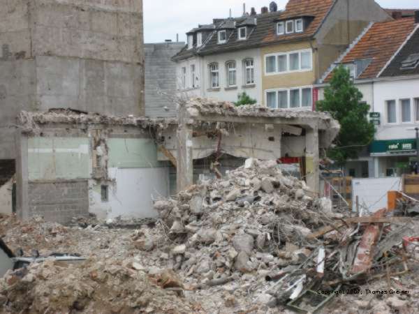 Auf der rechten Seite unten, kann man die Reste des Handyshops erkennen, welcher in das Woolworth Gebäude integriert war. Auch der Automat der Sparkasse Aachen, der hier einmal angebracht war, wurde inzwischen entfernt.